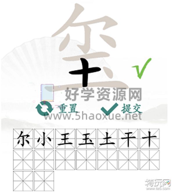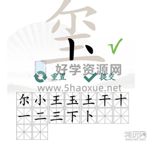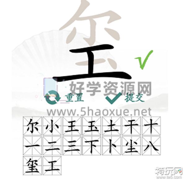 答案:尔、小、王、玉、土、干、十、一、二、三、下、卜、尘、八、玺、工。