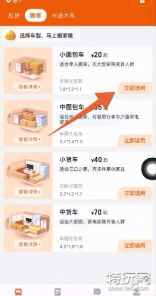 2、点击进入搬家页面当中,选择自己所需要的车型进行使用。