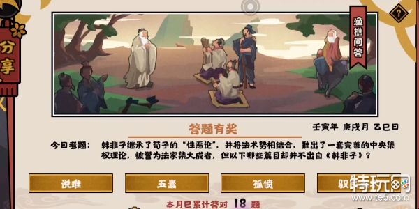 下面就一起来看看11ba小编带来的无悔华夏渔樵问答10.19答案一览。渔樵问答是无悔华夏的经典日常答题玩法,在这个玩法中玩家每天都会面对一个新的历史相关的问题,今天的问题是有关于春秋战国时期法家代表韩非子的著作的,难度比较大,感兴趣的玩家快来看看吧!