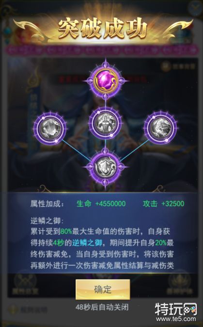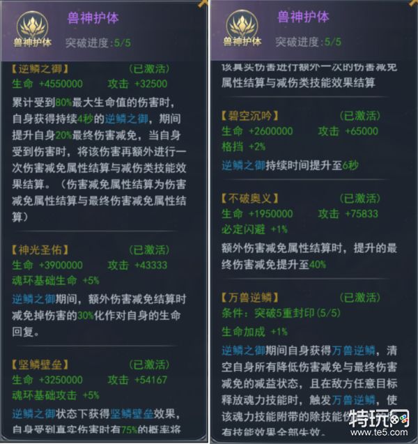 3、共有五层封印,封印均突破完成后,更可获得额外的强力技能,使兽神逆鳞提供更强的护体效果!