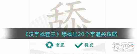 汉字找茬王舔找出20个字怎么过?汉字找茬王是抖音上非常流行的文字类解谜游戏,有趣的文字元素巧妙地融入谜题中,给你带来新奇的解谜体验,在巧妙的设计下的,文字也可以玩出不同的花样,你将惊叹于设计者的精彩创意,游戏中的解谜类型是非常多的,而找字谜题是游戏中的常见谜题之一,舔找出20个字是新出的找字关卡,舔字大家都不陌生,它主要由左右两边组成,在分解查找后也不要忘记将两边结合起来看,这样才不会有遗漏,具体的汉字找茬王舔找出20个字通关攻略下面由小编来为大家带来,未能通关的小伙伴可以参考一番。