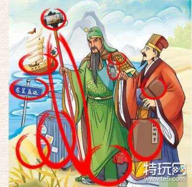 1、【单刀赴会】不合理的地方为:自拍杆手机、杰克肉丝、邮轮、路牌、行李箱、大哥大、特产、羽毛、金箍棒、东北裤子、公文包、孙悟空脸谱