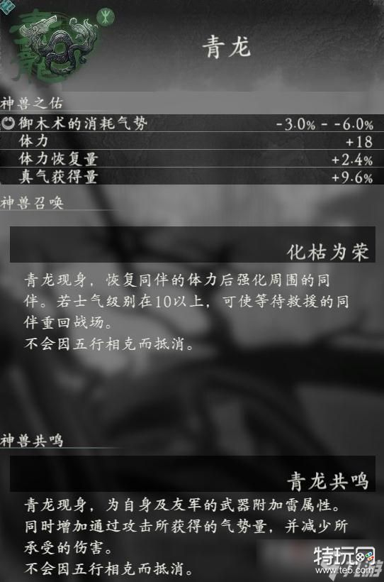 在《卧龙:苍天陨落》中,青龙为木系神兽,可以为玩家提供回血和附加雷属性效果。