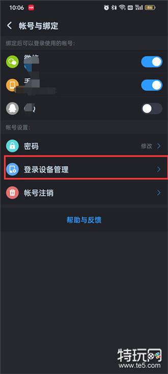 5.最后进入到账号与绑定的页面点击【登录设备管理】之后,在该页面选择你要取消登陆的设备后点击【退出登录】即可;