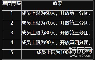 军团等级是军团规模的衡量指标,可在军团内政界面,消耗军团资金进行提升,影响军团人数上限、分团数量、内政建筑升级、资金存储上限、军团科技研发、军团商店道具种类等等。