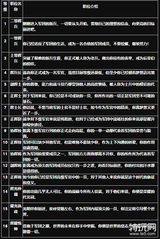 军团长:军团团长,可对本军团的全部职位进行任命,可获得最高的图腾战斗力加成。