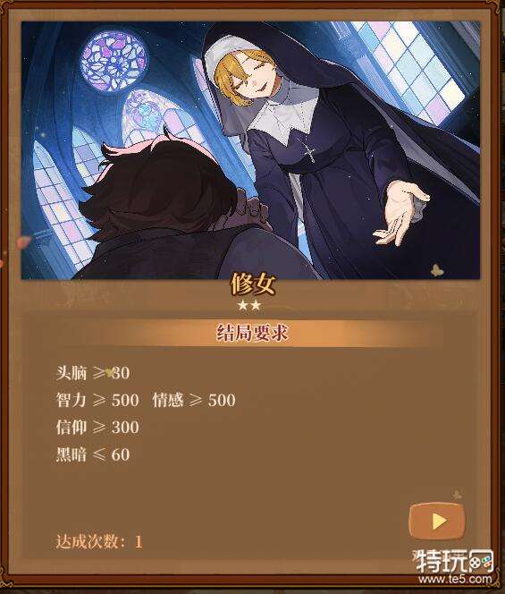 修女结局的条件是头脑≥30、智力≥500、情感≥500、信仰≥300和黑暗≤60。