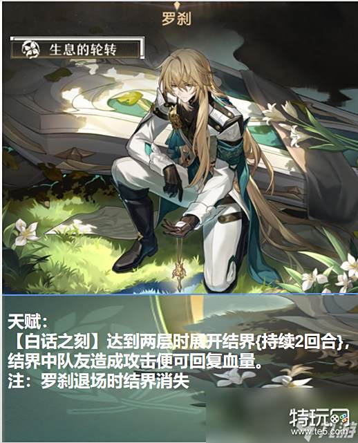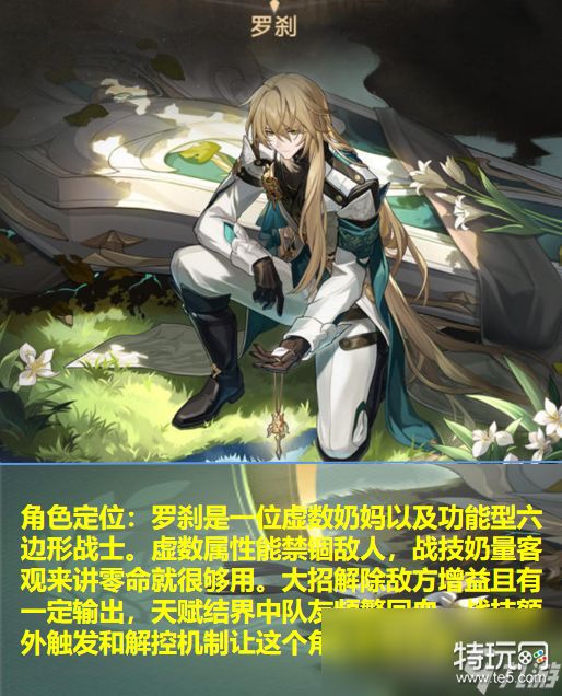 罗刹作为一位虚数角色,主要作用是回复血量以及消除敌方增益。额外还有虚数禁锢以及解控和一定输出破盾能力。在队伍里罗刹这名角色一定不是一个纯奶妈,他在其他方面的作用也是拿得出手的,核心技能是白花之刻展开结界,战技单体回复以及大战群体输出和削减增益,在使用上可以和烧血角色(刃)形成循环,也可以在虚数禁锢队伍打出优势,更多的是在队伍里充当六边形战士,增加容错率的同时,提供一些输出和削弱敌方,一手虚数禁锢打出来也是可圈可点。这名角色在使用上可能会有不同的方向。