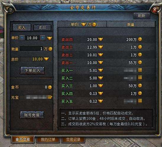 不过,稍微提醒大家注意一个习惯问题,老传奇玩家习惯,1元宝(最小单位)买多少东西。在金币交易行里,是1万金币(最小单位)卖多少元宝。1万金币就是股票里的一手。金币交易行里显示的单价,都是 1手(1万金)的价格。