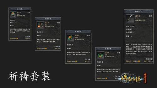 曾经,祈祷套装在传奇里是血雨腥风的代名词。在《传奇永恒》中,它是由神秘工匠用亲人的灵魂打造出的一套五件宝物,据说夜半时能听到其中人语交谈声。而佩戴全套,还将触发神秘效果。至于是什么效果,请容小编卖个关子,留待玩家亲自到游戏里体验吧。