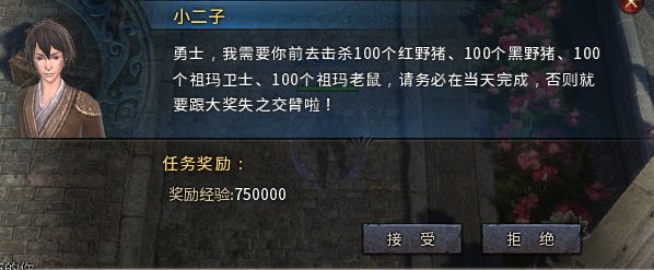 1、玩家每天可至NPC小二子处,领取到击杀400只怪物任务,限当天完成。任务内容为:击杀100个祖玛卫士、100个祖玛老鼠、100个红野猪和100个黑野猪。
