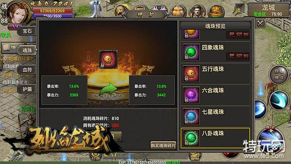 魂珠是一种特殊的属性装备,拥有强大的暴击属性,能够提高暴击率和暴击力,此珠在手,刀刀暴击不是梦!在主界面点击‘神炉’,再选择左侧‘魂珠’即可进入界面。为自己的魂珠升级进一步提高暴击属性!
