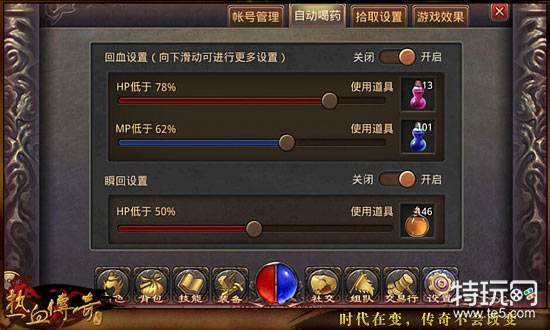 不管在自动战斗还是挂机时,设置好红蓝药品的恢复是非常重要的。大家在【自动喝药】栏中可以进行回血设置和瞬回设置。回血设置包括血量恢复和魔法值恢复,记得一定要点开启,点关闭的话是不会自动恢复的。而瞬回设置可以瞬间恢复大量血量,建议玩家瞬回设置血量还是稍微设置的高一点,否则有时候会因为药瓶CD导致无法及时喝药的情况出现。玩家可以在药品栏中选择对应的恢复药品,根据不同的战斗场合选择不同的药品设置。