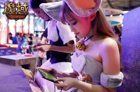 图注:现场开放《魔域口袋版》体验区,有美女陪玩哦