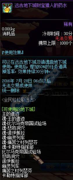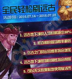 dnf体验服2016.7.7最新更新 全民轻松刷远古活动,远古图入场材料减少,爆率增加,可以无限使用复活币,小伙伴抓紧刷远古了!
