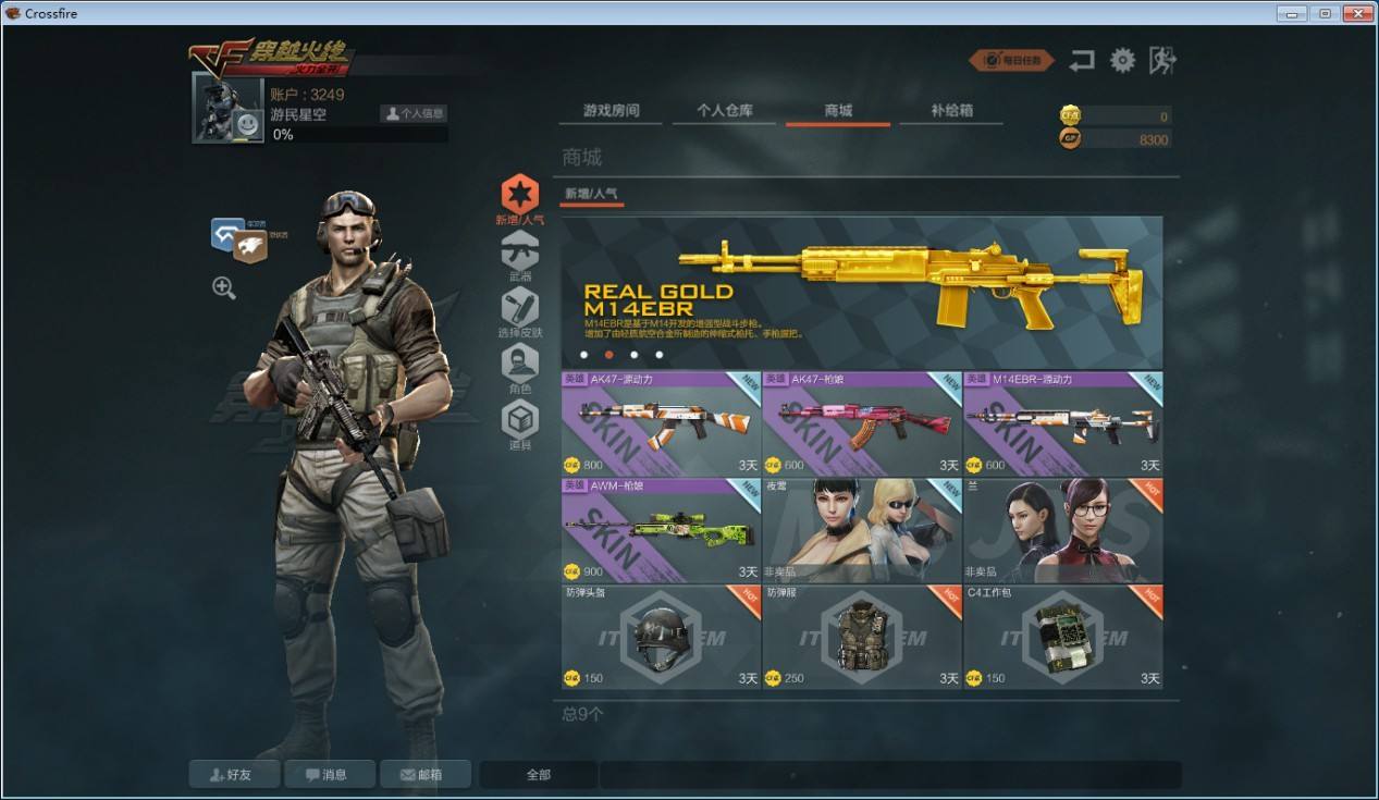 在页面中仓库可以查看玩家拥有的武器装备,系统在开始时会赠送一把M4A1供玩家体验。在商店里可以看到,目前《穿越火线火力全开》中武器与角色皮肤已经初具规模,《穿越火线》中绝大多数的经典枪支和一些比较出名的武器人物都已经加入进来。