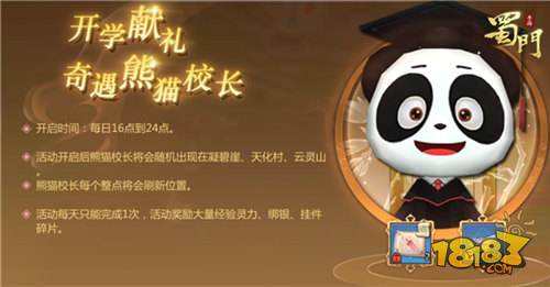 开学季活动开启后,在限定时间内熊猫校长将会随机出现在凝碧崖、天化村、云灵山,等待着蜀友与之相遇,且每过整点将会刷新位置,大家还不抓紧时间去蜀门世界里畅游,寻找熊猫校长的身影?