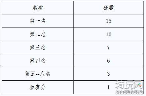 1.各代表队每个项目的运动员按照名次取得积分,未获名次取得参赛基础分。每代表队各个项目运动员取得积分之和为该代表队的团体总分。各项目计分方法如下: