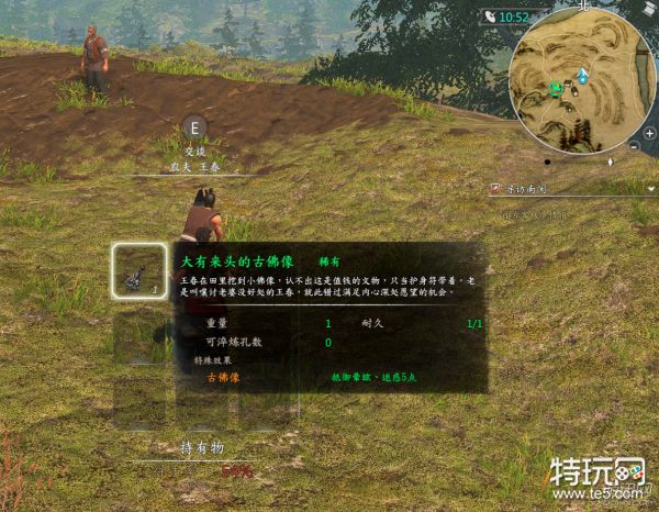 农夫王春(在村子右上角)身上有个饰品,感觉是个有点道行的东西,,岂能放过旁边外乡客身上有布包,500钱