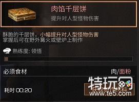 酥脆的千层饼,小幅提升对人型怪物伤害;掌握后可在野外篝火或壁炉上制作