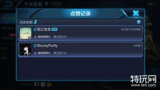 访问其他玩家主页时我们可以点击个人主页点赞按钮对玩家进行点赞,该玩家可以在点赞记录中看到。