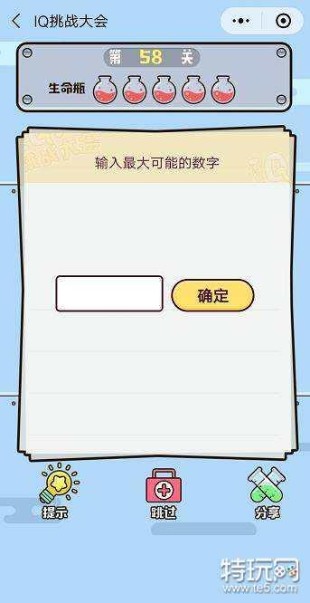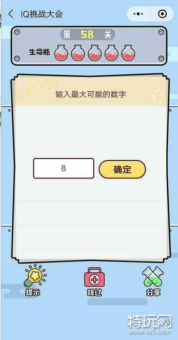 IQ挑战大会第58关图片中就一个框框,然后要求我们输入最大可能的数字,你们觉得最大的一个数字是什么呢?看到答案之后是8,很多玩家看到答案之后也不明白为什么会是8呢?小编为大家整理了第58关的答案解析哦!