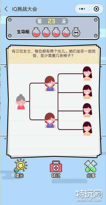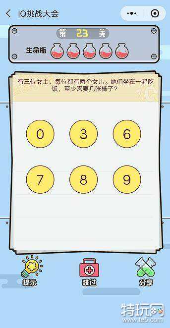 有三位女士,每位都有两个女儿,他们坐在一起吃饭,至少需要几张椅子?