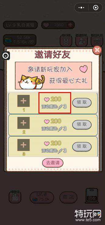 每次邀请一次好友,就有机会获得3根逗猫棒和200颗爱心奖励