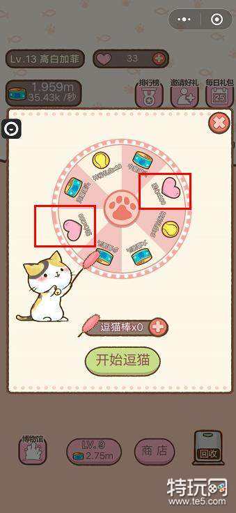 消耗逗猫棒转动转盘,转盘中可以获取100爱心和200爱心!