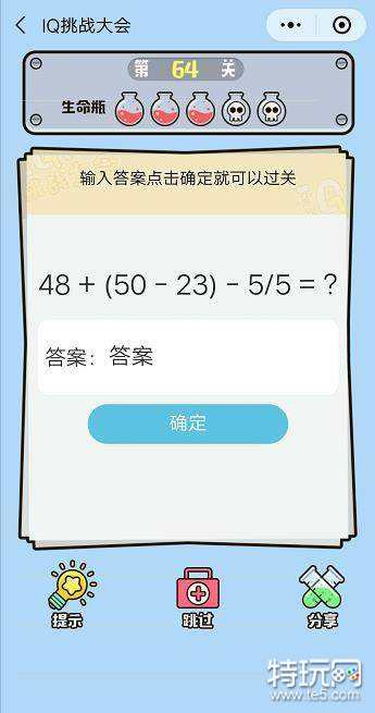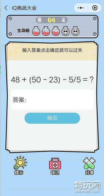 IQ挑战大会第64关输入答案点击确定就可以过关48+(50-23)-5/5=?