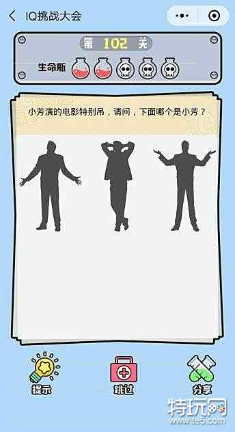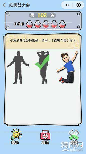 IQ挑战大会你们玩到哪一个关卡啦?最后一个关卡就是第102关,这一关难度有点高,小芳烟电影很厉害,请大家找这几个剪影中哪一个是小芳,你们认识小芳吗?这一关的操作还是比较难的,小编为大家带来了正确的操作方法分享给大家!