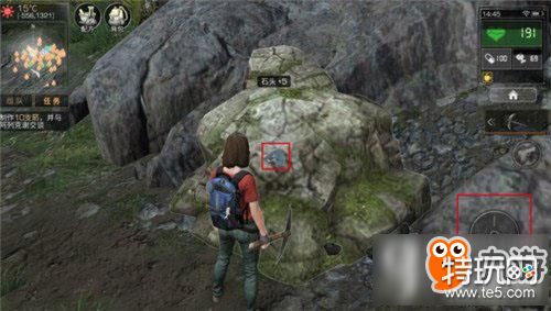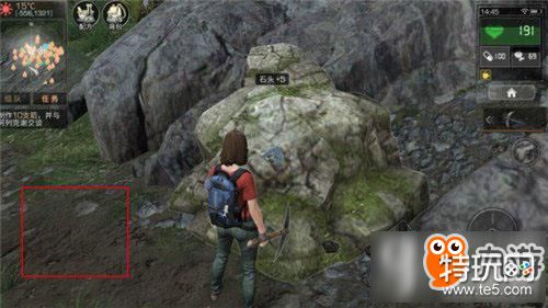 讲完移动的简单介绍,我们来说下如何获取资源!首先我们看到屏幕内是一个石头!我们换上挖石头需要的工具,然后看到屏幕中间有一个十字架,那是个准心,我们把准心瞄准需要开采的石头,然后点击右边的原型按钮,这时候我们就可以进行采集资源啦!