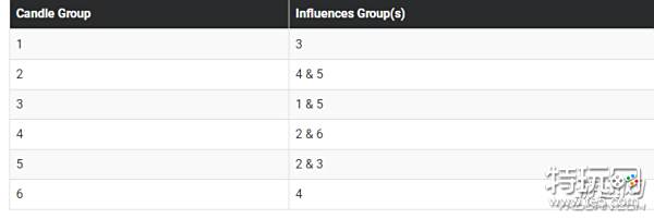 下面蜡烛分别标注序号,每个序号位置的蜡烛 会影响的蜡烛见下面表格。