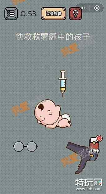 最强脑洞游戏第53关图片中是一个孩子,旁边有雾霾,我们怎么才能救救这个孩子呢?图片中的针管、眼镜和吹风机哪一个管用呢?还没有完成通关的小伙伴们就来看正确操作方法吧!