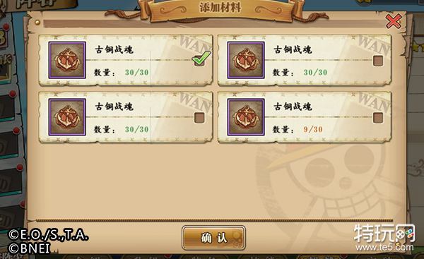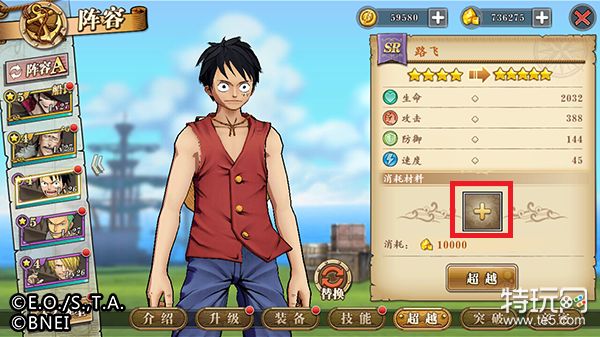 超越也是提升角色属性的重要途径之一,而超越使用的材料,就是同样的角色,或者30个角色碎片,或者30个古铜战魂!以路飞超越为例: