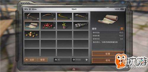 首先我们选择在左边的物品栏目内选择绷带,可以看到会出现一个界面,显示绷带的持续秒数以及回血。下面还有个配置的按钮