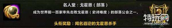 名人堂是8.0新出的一个成就,联盟和部落前100名击杀史诗戈霍恩的公会将会被授予[名人堂:戈霍恩(联盟)]或[名人堂:戈霍恩(部落)]成就。公会成员将会获得[闻名遐迩的戈霍恩杀手]头衔,即使你是公会小透明未参与开荒也会获得。