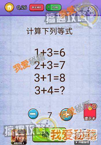 《燃烧吧我的大脑》游戏第26-30关的问题分别是:计算下列等式、请把元宝放到储蓄罐上、让老王进家门、穿过豆腐渣工程到达终点、老王在哪了。下面我爱秘籍小编给大家一一分享答案。