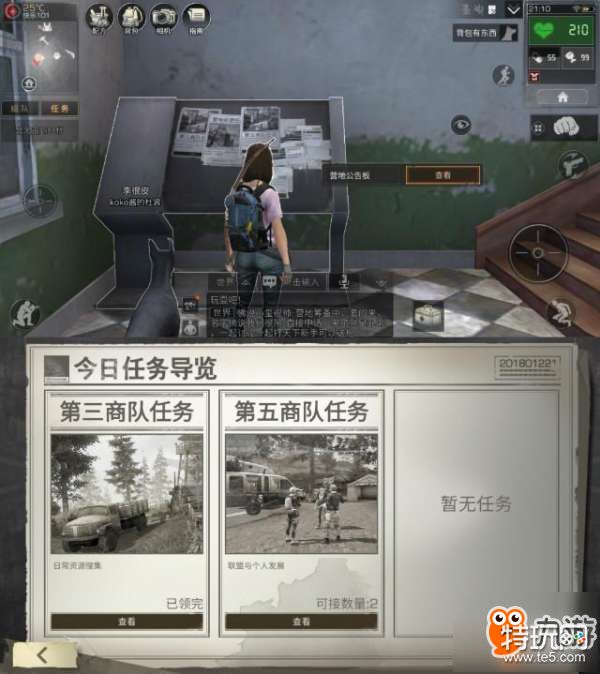 进入商会以后我们来到一旁的营地公告板,点击查看就会显示今日的任务导览,接着选择自己想要领取的任务就OK啦!