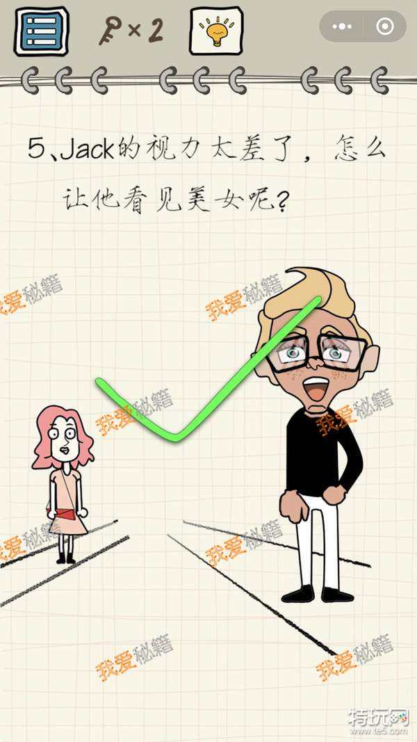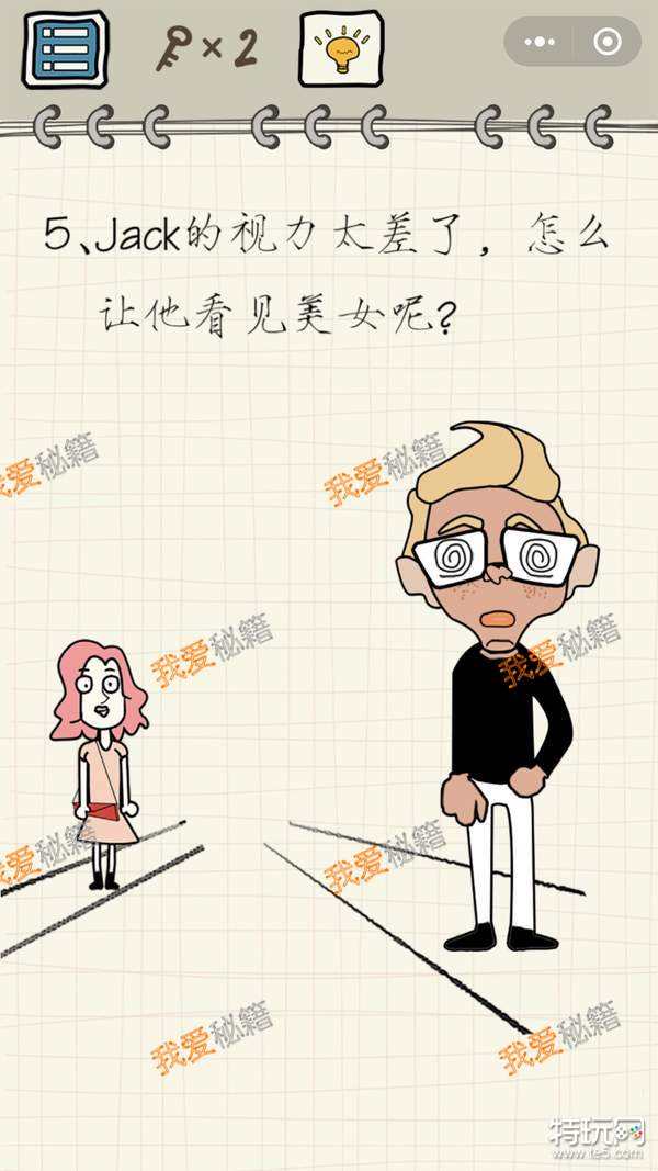 本关仔细观察,就能看到Jack眼睛是不干净的哦,想要让他看到美女,虽然带着眼镜,但是眼镜片太脏,依旧看不到, 只能先把眼镜擦干净啦!