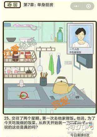 “交往了两个星期,第一次去他家做饭。他说,为了今天能够吃到我做的饭菜,从昨天开始就一直饿着肚子,他说的这些是真的吗?”是《疯狂女神探》25关的问题,下面我爱秘籍小编给大家分享攻略。