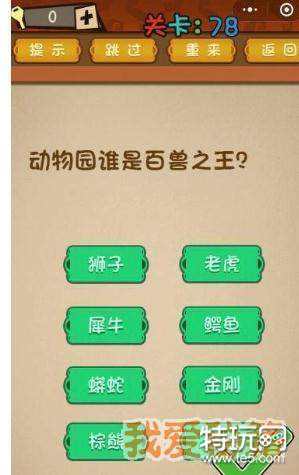动物园谁是百兽之王?这是微信小游戏最强脑力大乱斗第78关的过关题目,在图片上,还有不少选项让玩家来进行选择。面对众多选择,究竟哪个才是最正确的?一起来看看本关的过关答案吧!