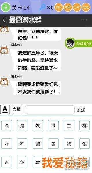 “最囧潜水群,墙裂要求群主发红包”是微信小游戏智商大爆炸14关问题。这题给出的很像一个微信群,大家在讨论。但是有我们正常的微信群少了一个+的功能,发红包隐藏在哪里呢?