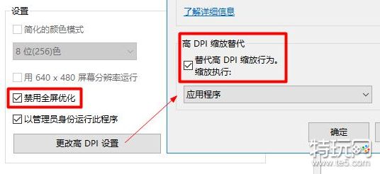 将禁用全屏优化勾选上,替代高DPI缩放行为也勾选上(win10版本不同可能位置不太一样),应用即可。