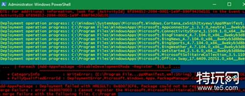 Get-AppXPackage | Foreach {Add-AppxPackage -DisableDevelopmentMode -Register "$($_.InstallLocation)\AppXManifest.xml"}