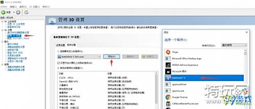 6、选择3D设置——管理3D设置——点击程序设置,选择添加,添加战 地5;