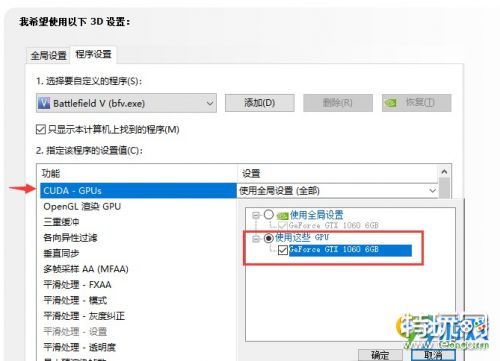 7、选择CUDA-GPUs,从全局设置修改为独显,点击确定保存,重启游戏即可!