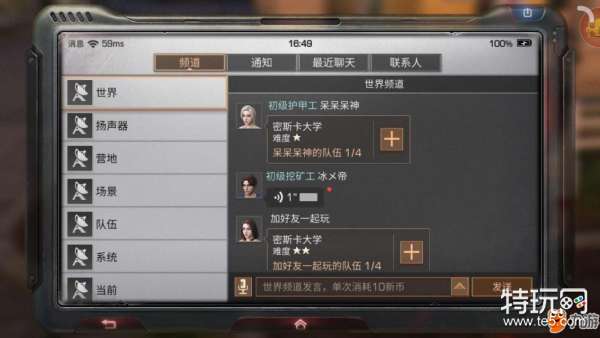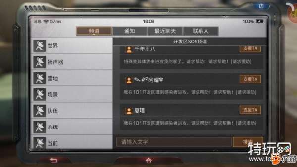 在世界频道中,经常有一些消息刷新。玩家可以打开世界频道,点击招募信息后的“支援TA”或者“+”就可以和其他玩家一起玩耍了。
