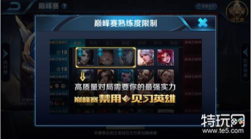 为了给到大家更加正向的对战环境和条件,我们将会在“巅峰赛”限制选取英雄的熟练度,禁用见习英雄,希望大家能够以一个更加严谨认真的态度去对待比赛。