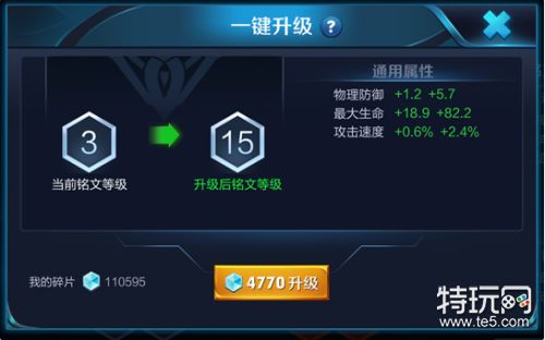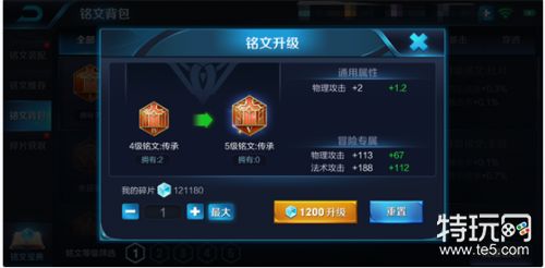 当玩家拥有足够的铭文碎片时,可以直接将低级铭文升级为属性相同、数值更高的高级铭文,也可以一键将某个铭文页上的所有铭文进行升级。